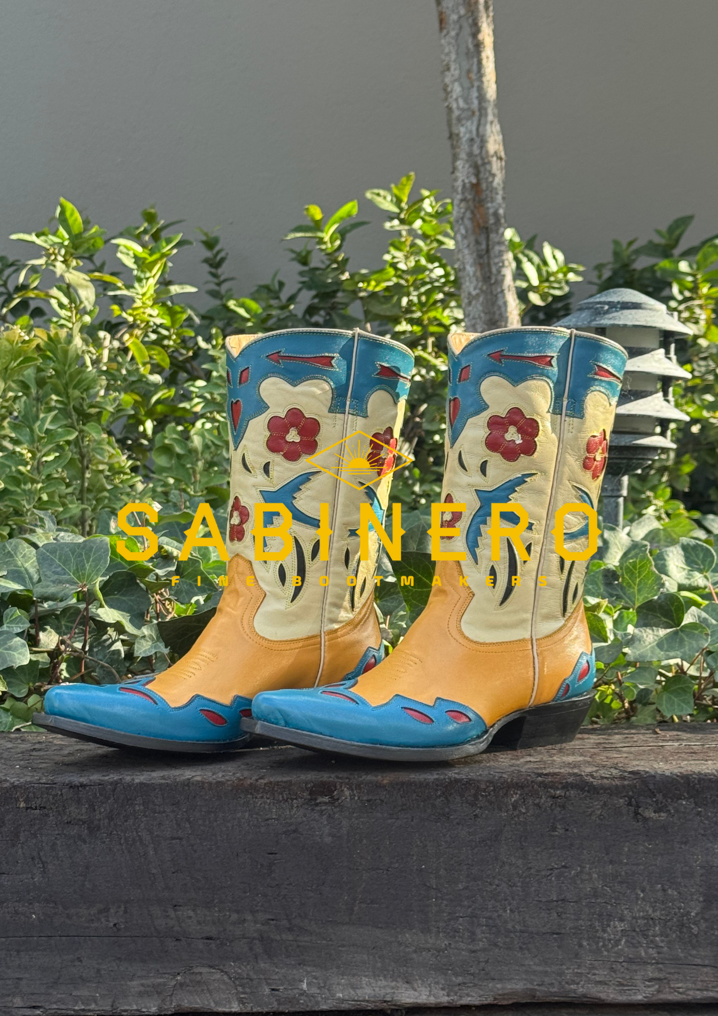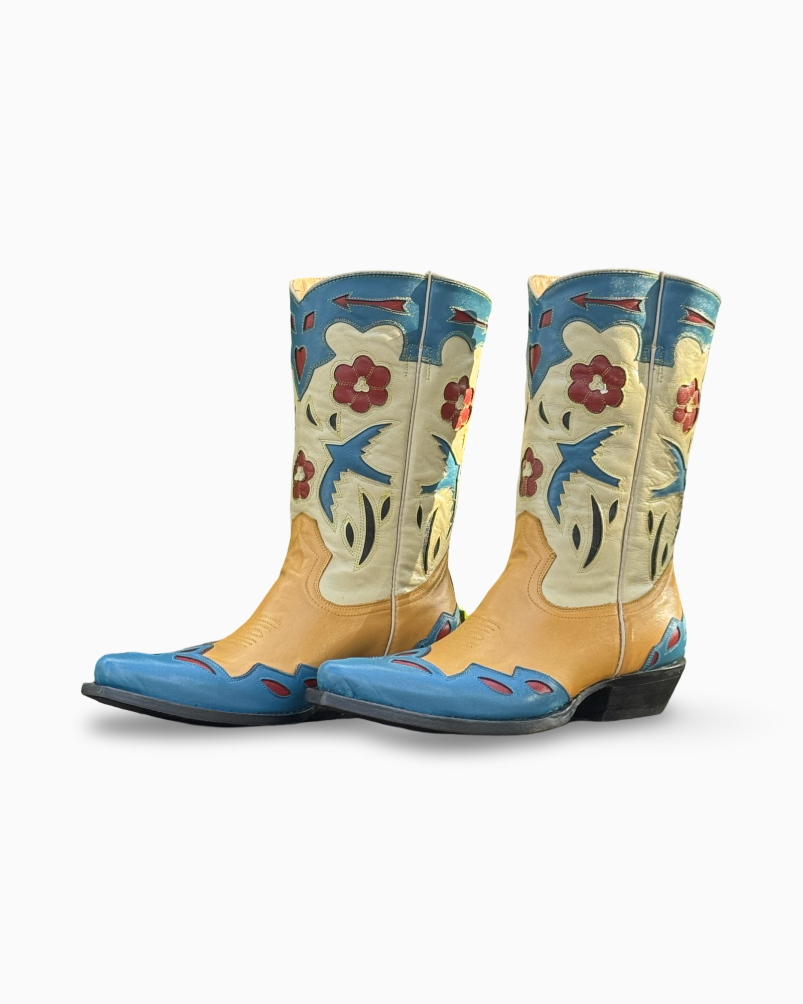 Bota vaquera para dama en piel genuina, con combinación de colores azul, amarillo y marfil, y motivos florales y aves bordados a mano en la caña. Un diseño expresivo y artesanal que destaca por su colorido, detalle y personalidad dentro del estilo western.