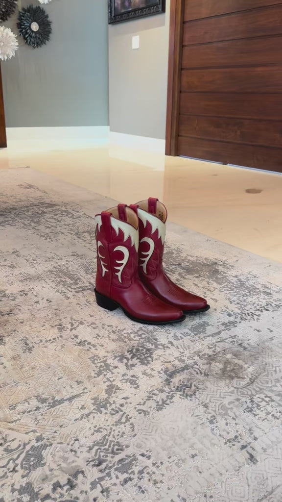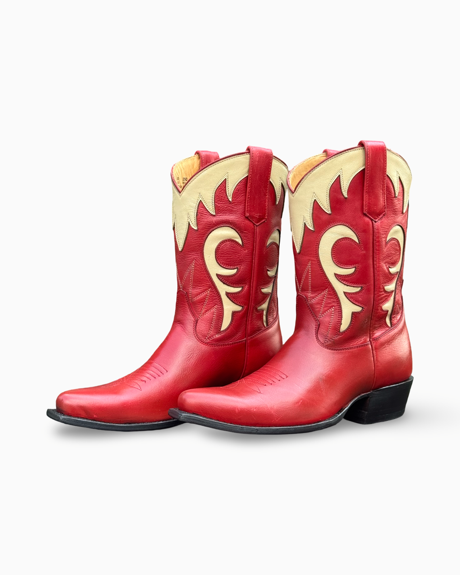 Bota vaquera para dama elaborada en piel genuina color rojo, con contrastes en piel clara y bordado western clásico en la caña. Un diseño limpio y atemporal que resalta por su color sólido, silueta estilizada y carácter auténtico.