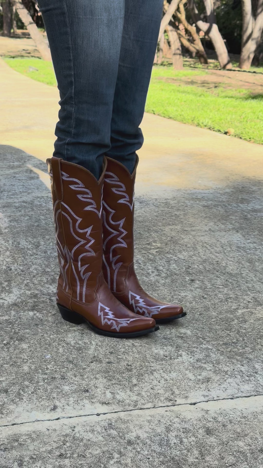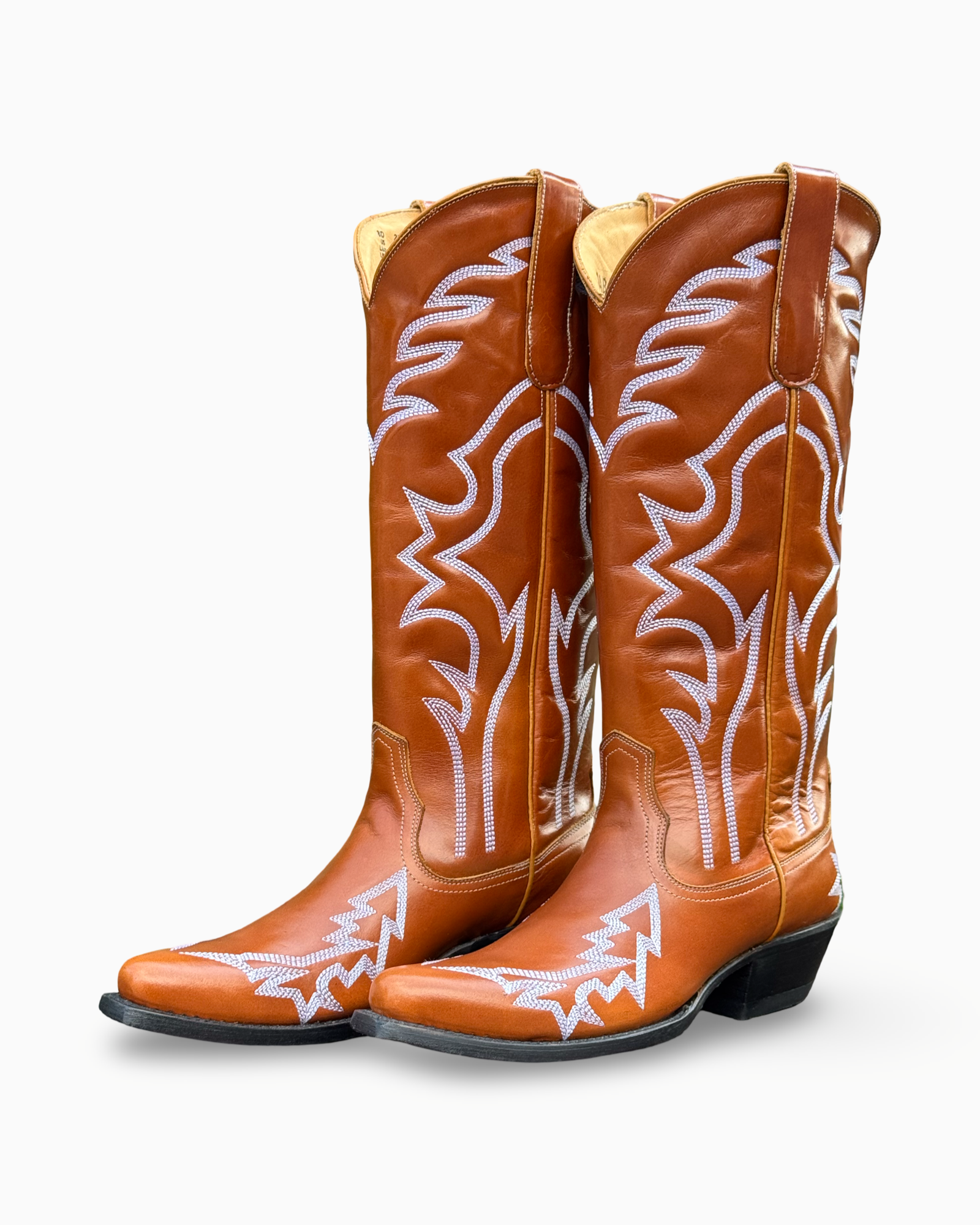 Bota vaquera para dama en piel genuina color camel, con bordado western en contraste que aporta carácter y personalidad. Su diseño estilizado y su acabado artesanal la convierten en una pieza protagonista dentro del estilo cowgirl contemporáneo.