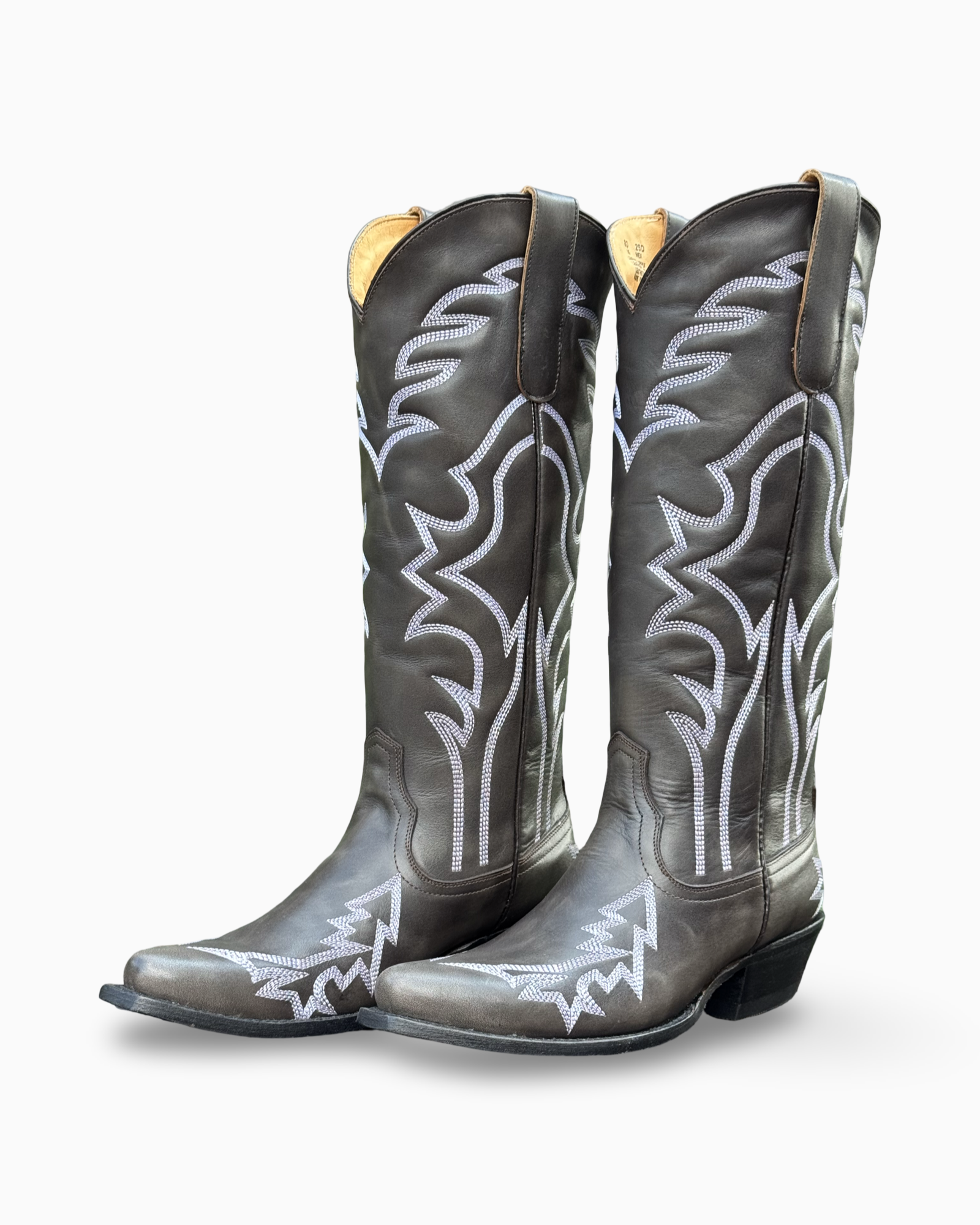 Bota vaquera para dama en piel genuina color gris, con bordado western en contraste que aporta carácter y personalidad. Su diseño estilizado y su acabado artesanal la convierten en una pieza protagonista dentro del estilo cowgirl contemporáneo.