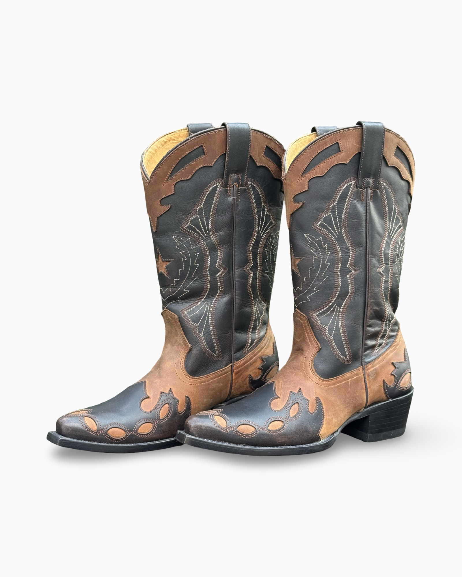 Bota vaquera para dama elaborada en piel genuina en tonos café y negro, con bordado western clásico en la caña y detalles contrastantes en la punta. Un diseño sólido y atemporal que refleja el espíritu tradicional del western, con presencia fuerte y bien balance