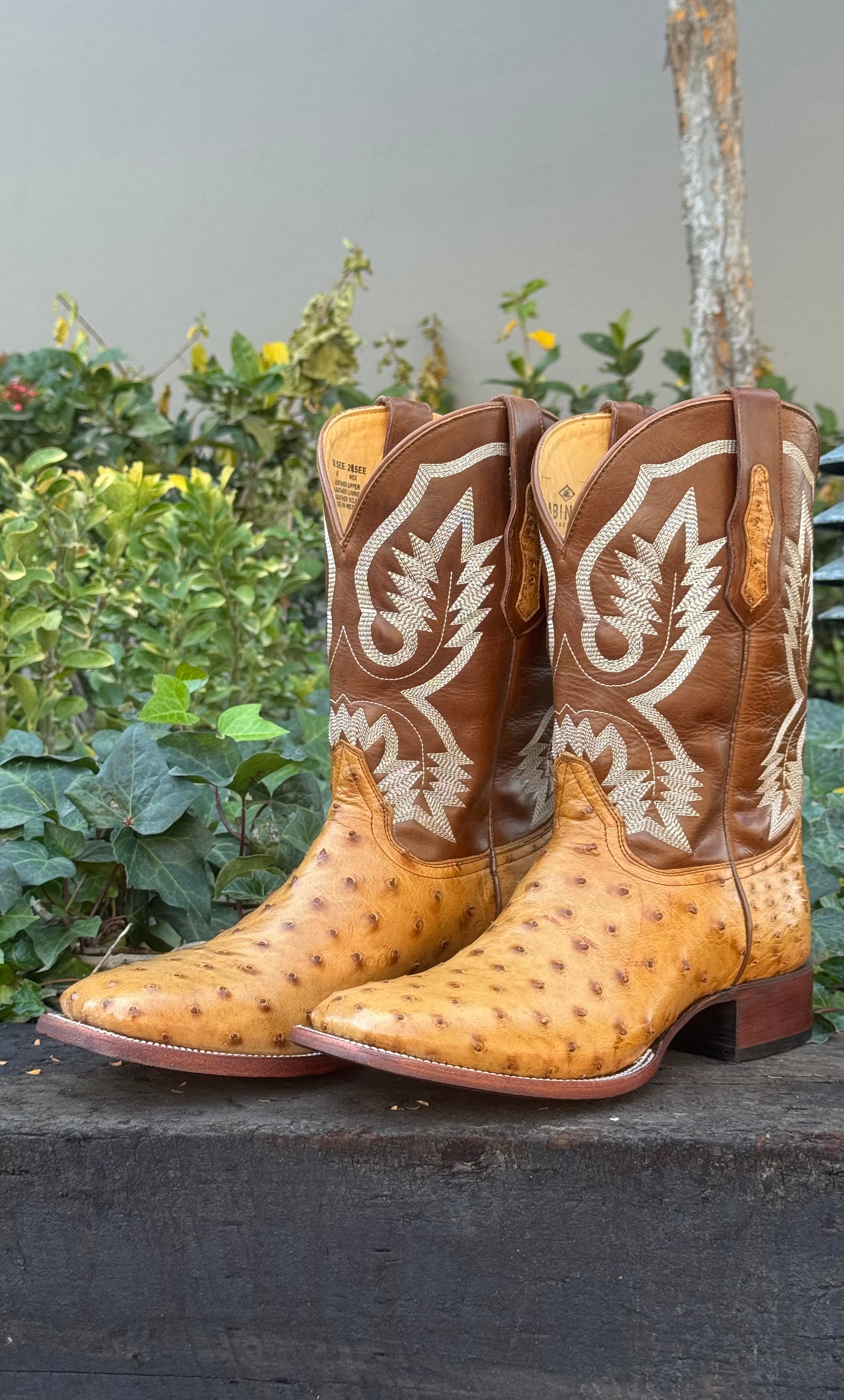 Bota vaquera para caballero elaborada en piel genuina de avestruz color umber, con bordado western clásico en el tubo y horma cuadrada de carácter firme y auténtico.