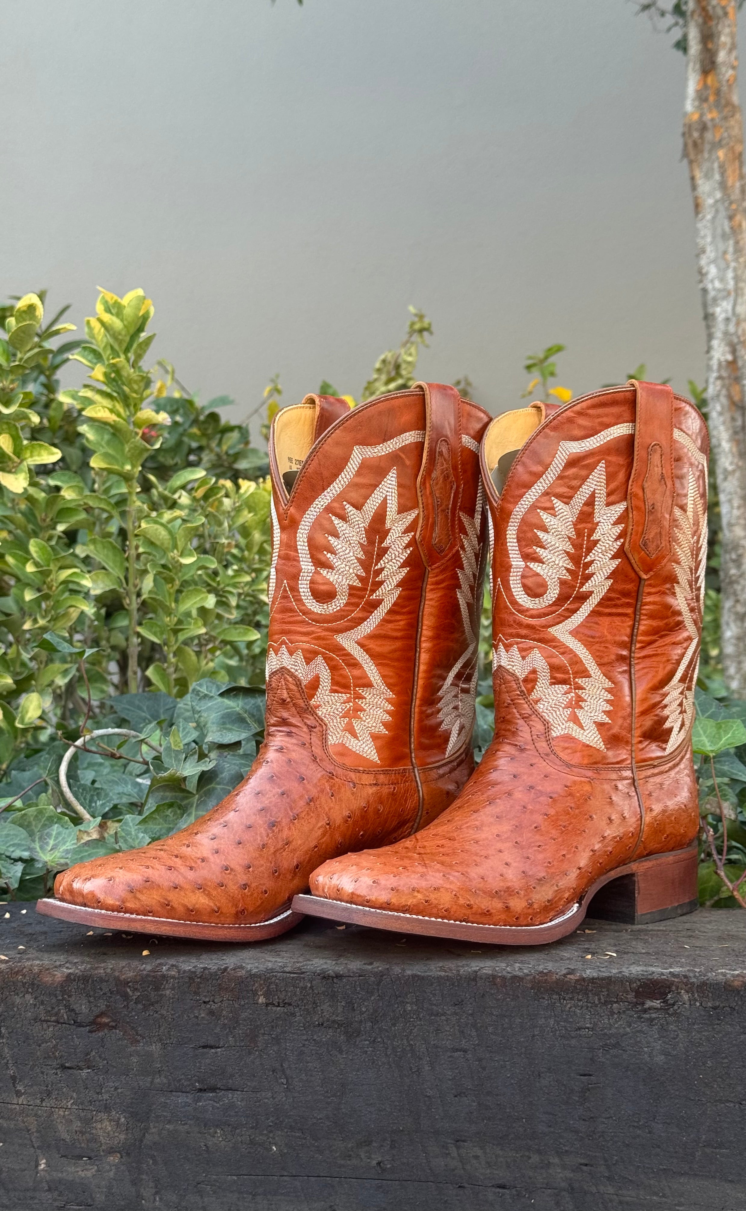 Bota vaquera para caballero elaborada en piel genuina de avestruz color brandy, con bordado western clásico en el tubo y horma cuadrada de carácter firme y auténtico.